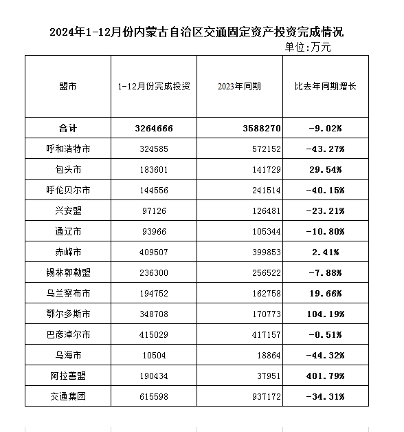 2024年1-12月份全区公路水路交通固定资产投资完成情况(分单位)