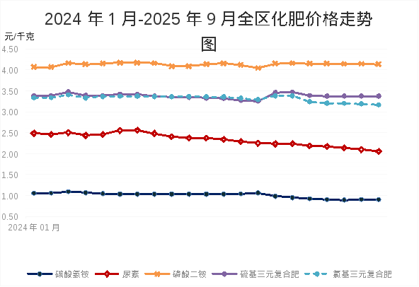 北方地区种植多以一年一熟制为主,现阶段正处于收获期,农业用肥需求处于淡季,市场观望氛围浓厚,仅少数经销商逢低略有备肥。尿素市场需求延续低迷态势,供大于求的压力进一步增加,尿素价格震荡下行。具体来看,碳酸氢铵、尿素、磷酸二铵、硫基三元复合肥、氯基三元复合肥(均为国产,下同)9月份全区月度平均价格分别为每千克0.90元、2.05元、4.13元、3.37元、3.16元,与2025年8月相比(下称环比)尿素、磷酸二铵、氯基三元复合肥价格分别下降2.07%、0.24%、0.73%,碳酸氢铵、硫基三元复合肥价格均持平,与2024年9月相比(下称同比),碳酸氢铵、尿素、氯基三元复合肥分别下降12.62%、14.70%、5.67%,磷酸二铵、硫基三元复合肥分别上张1.14%、0.69%。