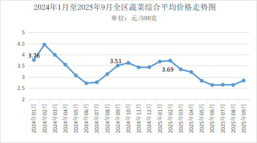 11月份,全区蔬菜综合平均零售价格为3.75元/500克,环比上涨20.97%。监测的15种蔬菜品种价格均有所上涨,上涨幅度居前的品种为韭菜、圆白菜、西红柿、茄子、黄瓜,分别上涨38.70%、38.06%、29.91%、28.42%、25.60%。同比,15个蔬菜品种综合平均零售价格上涨9.33%。