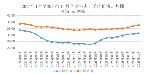 牛肉、去骨羊肉11月全区平均零售价格分别为每500克33.85元、37.50元。环比,牛肉、去骨羊肉价格分别上涨0.92%、1.30%。同比,牛肉、去骨羊肉价格分别上涨16.64%、6.53%。