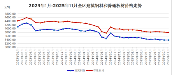 11月份,建筑钢材、普通板材全区综合平均价格分别为每吨3389.44元、3792.31元。与2025年10月相比(下称环比),建筑钢材价格略涨0.04%,普通板材价格略降0.48%;与2024年11月相比(下称同比),建筑钢材、普通板材价格分别下降5.30%、4.68%。