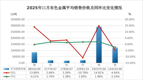 锌(0# 锌锭)、锡(1# 锡锭)、镍(1#)11月平均销售价格分别为每吨22933.33元、292375.00元、124125.00元。环比,锌、锡价格分别小幅上涨1.83%、1.98%,镍价格小幅下降2.24%;同比,锡价格上涨14.81%,锌、镍价格分别下降10.78%、4.64%。