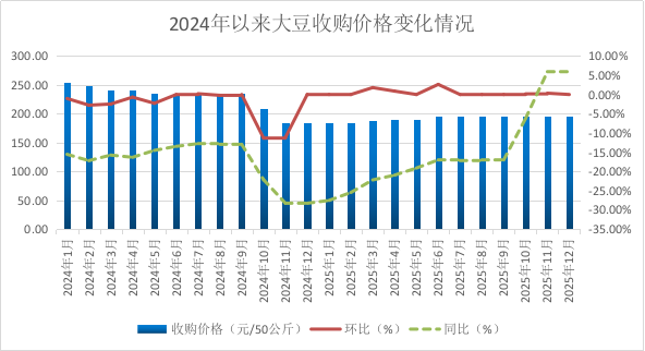 从月度价格走势看,1—12月份全区大豆收购价格整体呈现稳中波动上涨态势。春节前产区农户手中大豆余粮较多,需求相对稳定,节后工厂复工,收购主体增加,市场迎来一波交易活跃期;6月份基层余粮不足,供应量偏紧,大豆价格小幅上涨。第三季度基层粮源基本见底,市场购销放缓,下游豆制品消费需求处于淡季,加工企业以刚需补库为主,国产豆价格总体平稳。第四季度因前期收获季遭遇连续阴雨天气,导致关内大豆降质减产,更多贸易商采购优质东北大豆补库,叠加今年东北豆农惜售情绪较重,共同推动大豆价格震荡上行。截至12月份呼伦贝尔市大豆每50公斤平均收购价格为196.00元,比年初价格上涨5.95%。