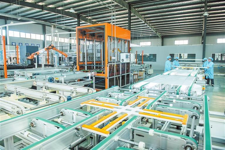 定西创盛光能源有限公司通渭县200兆瓦高效太阳能光伏组件生产车间内,工人们加紧生产。新甘肃·甘肃日报通讯员 张子斌