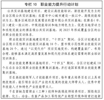 加快重点地区、重点领域急需紧缺技能人才的引进和培养,实施“百千万”高技能人才培养计划,推动具备条件的行业企业建立首席技师制度。建立健全技能人才多元评价体系,开展技能人才职业资格评价、职业技能等级认定和专项职业能力考核。打通高技能人才与专业技术人才职业发展通道,在更多领域实现互评互通。强化职业技能竞赛指导教师培养,建设一批职业技能竞赛集训基地,加大各类职业技能竞赛组织开展和选拔力度,提升自治区职业技能竞赛整体水平,促进优秀技能人才脱颖而出。组织实施“技能中国行动”内蒙古行动,完善技能人才培养、使用、评价、激励机制。加大高技能人才培训基地、技能大师工作室建设力度,加强高技能人才师资队伍建设。做好高技能人才调查统计和需求预测工作,完善高技能人才实时信息管理平台,开发高技能人才信息库和技能成果信息库。“十四五”期间预计培养14万名高技能人才。