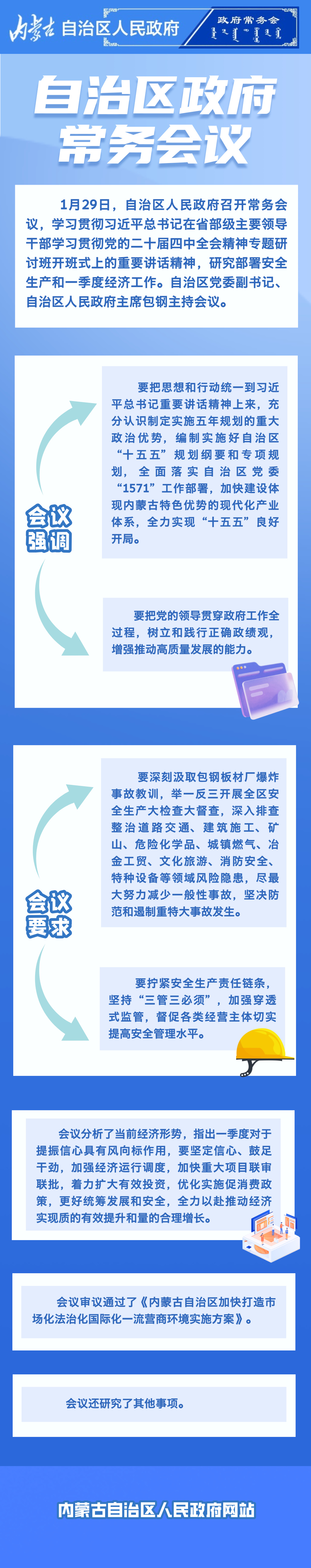 1月29日,自治区人民政府召开常务会议,学习贯彻习近平总书记在省部级主要领导干部学习贯彻党的二十届四中全会精神专题研讨班开班式上的重要讲话精神,研究部署安全生产和一季度经济工作。自治区党委副书记、自治区人民政府主席包钢主持会议。