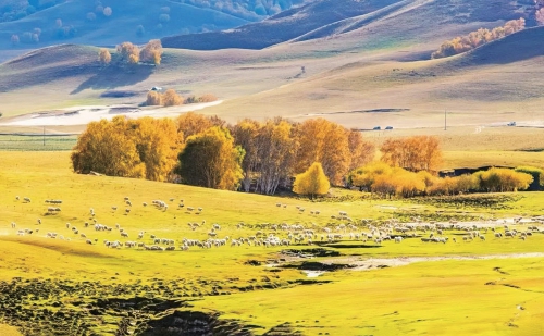 秋天的阿鲁科尔沁草原层林尽染、羊群肥壮。 资料图