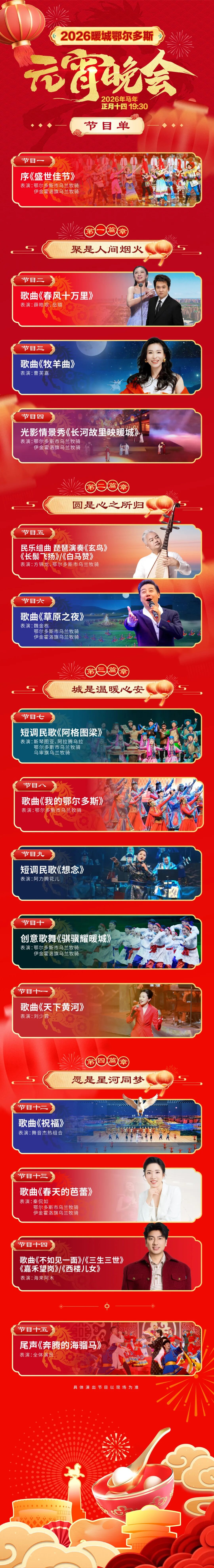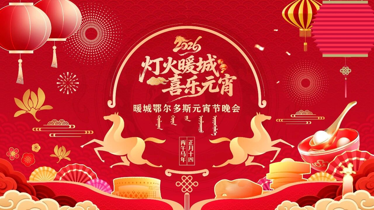 灯火映暖城,月圆共欢腾。2026暖城鄂尔多斯元宵晚会,不负期待、不负团圆,让我们以节为媒,共话暖城新貌,共赴美好新程,在喜庆祥和的氛围中,开启马年新岁的崭新篇章!诚邀广大市民游客相约现场,共赏文艺盛宴,共品元宵韵味,在万家灯火中喜迎佳节、共祝安康,一起见证暖城鄂尔多斯的别样元宵风采!