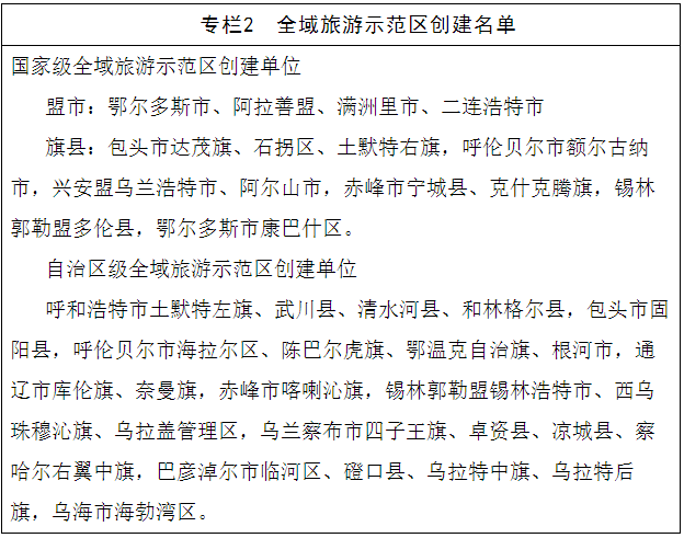 旅游交通集散咨询体系建设行动。突出重点,分类推进旅游交通集散地建设,重点将呼和浩特市、包头市、呼伦贝尔市、赤峰市、鄂尔多斯市、乌海市等城市打造成为国内重要旅游集散地,将巴彦淖尔市、乌兰察布市、巴彦浩特镇、满洲里市、二连浩特市、锡林浩特市、乌兰浩特市等城市打造成为区内重要旅游交通集散地,在大型景区及旗县设立旅游交通中心。