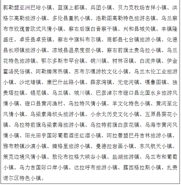内蒙古博物院、昭君博物院、蒙牛工业旅游区、伊利—乳都科技示范园、神泉旅游区、敕勒川草原文化旅游区、大青山太伟运动休闲度假村、大青山前坡生态旅游区、清水河老牛湾黄河大峡谷旅游区、大召历史文化旅游区、内蒙古赛马场、蒙亮旅游商品园、五当召旅游区、北方兵器城、南海湿地景区、美岱召旅游区、希拉穆仁草原旅游区、青鸟生态养生庄园、敕勒川风景旅游区、百灵那达慕文化产业园、呼伦贝尔草原国家公园景区、扎兰屯旅游度假区(含城区遗址、吊桥公园、金龙山、扬齐山水库、秀水等)、海拉尔国家森林公园、两河圣山景区、蒙兀室韦景区、白音哈达旅游度假区、中国达斡尔民族园、莫尔道嘎国家森林公园、红花尔基樟子松森林旅游区、巴尔虎蒙古部落 |