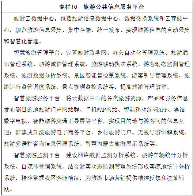 旅游公共信息服务平台建设行动。重点建设智慧旅游,加快建设标准统一、功能完善、衔接顺畅的智慧内蒙古旅游综合服务平台。