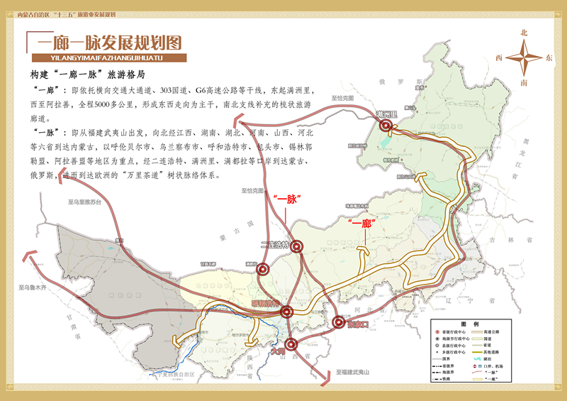 “一廊”即依托横向交通大通道、303国道、G6高速公路等干线,东起满洲里,西至阿拉善,全程5000多公里,形成东西走向为主干,南北支线为补充的梳状旅游廊道。