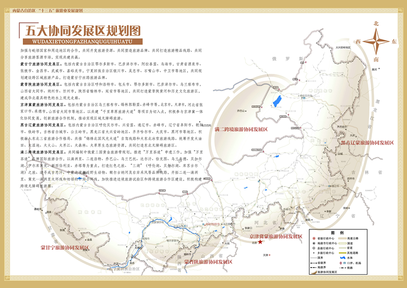 京津冀蒙旅游协同发展区。包括内蒙古自治区乌兰察布市、锡林郭勒盟、赤峰市,北京市,天津市,河北省张家口市、承德市,山西省大同市等地区。以共建“千里草原旅游大道”等项目为切入点,积极参与京津冀一体化协同发展,创新旅游合作机制,推动实现区域无障碍旅游。