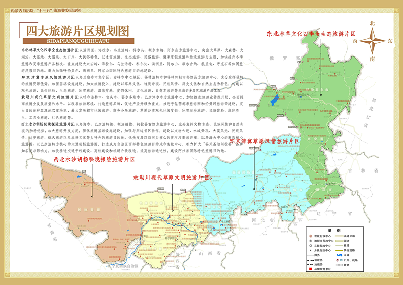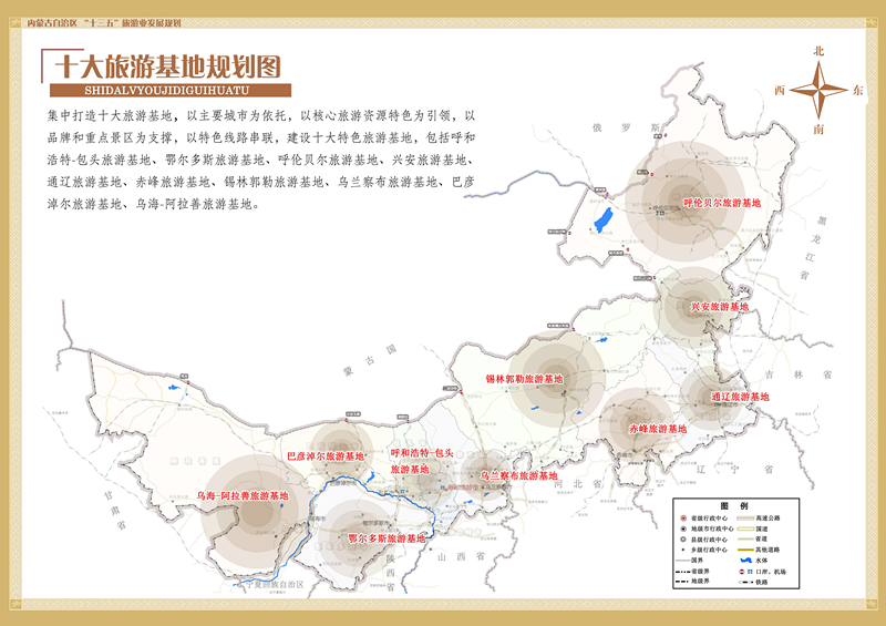 按照旅游资源分布和区位特点,着力建设东北林草文化四季全生态旅游片区(呼伦贝尔市、兴安盟、通辽市)、环京津冀草原风情旅游片区(赤峰市、锡林郭勒盟、乌兰察布市)、敕勒川现代草原文明旅游片区(呼和浩特市、包头市、鄂尔多斯市、巴彦淖尔市)、西北水沙胡杨秘境探险旅游片区(乌海市、阿拉善盟)。依托草原、森林、沙漠、冰雪、温泉、河湖、湿地、地质奇观、中俄蒙口岸、民俗历史文历史文化等十大旅游资源,全面展示壮美内蒙古。