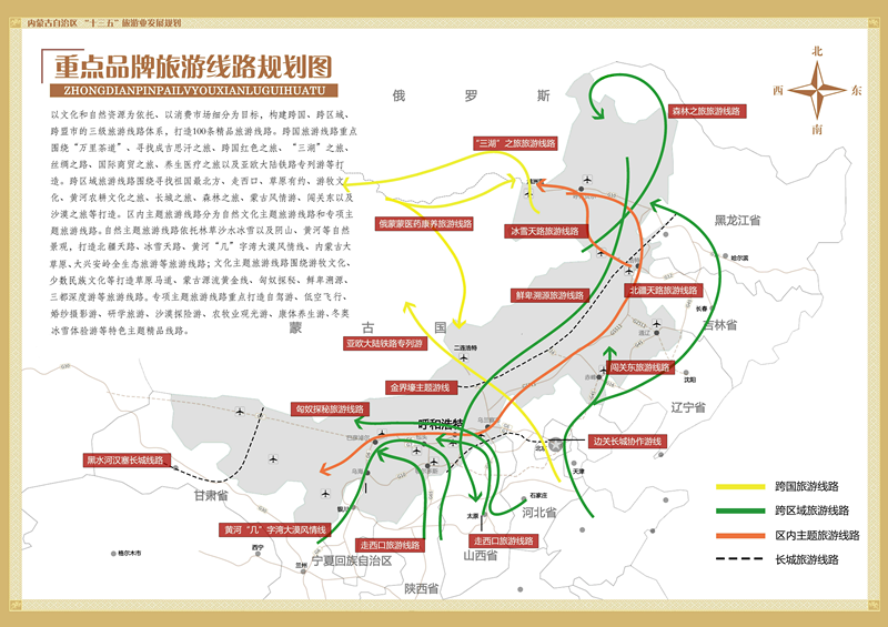 旅游精品线路建设行动。以文化和自然资源为依托、以消费市场细分为目标,构建跨国、跨区域、跨盟市的三级旅游线路体系,打造100条精品旅游线路。跨国旅游线路重点围绕“万里茶道”、寻找成吉思汗之旅、跨国红色之旅、“三湖”之旅、丝绸之路、国际商贸之旅、养生医疗之旅以及亚欧大陆铁路专列游等打造。跨区域旅游线路围绕寻找祖国最北方、走西口、草原有约、游牧文化、黄河农耕文化之旅、长城之旅、森林之旅、蒙古风情游、闯关东以及沙漠之旅等打造。跨盟市旅游线路分为自然主题、文化主题和专项主题旅游线路。自然主题旅游线路依托林草沙水冰雪以及阴山、黄河等自然景观,打造北疆天路、冰雪天路、黄河“几”字湾大漠风情线、内蒙古大草原、大兴安岭全生态旅游等线路;文化主题旅游线路围绕游牧文化打造草原马道、蒙古源流黄金线、匈奴探秘、鲜卑溯源、三都深度游等旅游线路;专项主题旅游线路重点围绕自驾、低空飞行、婚纱摄影、研学、沙漠探险、农牧业观光、康体养生、冬奥冰雪体验等特色主题打造。