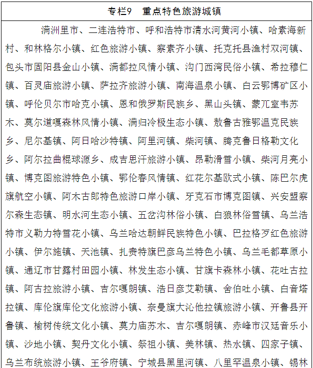 打造100条精品线路。以旅游公路、城市、景区和特色小镇等为依托,以国家级品牌资源、民族历史文化和自然生态资源为基础,建设跨国、跨省区、跨盟市的三级旅游线路体系,打造100条精品线路。