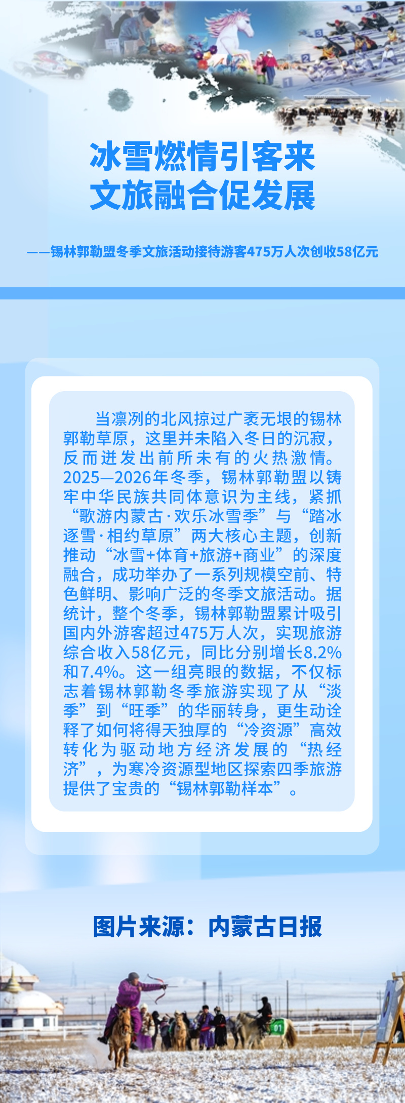 当凛冽的北风掠过广袤无垠的锡林郭勒草原,这里并未陷入冬日的沉寂,反而迸发出前所未有的火热激情。2025—2026年冬季,锡林郭勒盟以铸牢中华民族共同体意识为主线,紧抓“歌游内蒙古·欢乐冰雪季”与“踏冰逐雪·相约草原”两大核心主题,创新推动“冰雪+体育+旅游+商业”的深度融合,成功举办了一系列规模空前、特色鲜明、影响广泛的冬季文旅活动。据统计,整个冬季,锡林郭勒盟累计吸引国内外游客超过475万人次,实现旅游综合收入58亿元,同比分别增长8.2%和7.4%。这一组亮眼的数据,不仅标志着锡林郭勒冬季旅游实现了从“淡季”到“旺季”的华丽转身,更生动诠释了如何将得天独厚的“冷资源”高效转化为驱动地方经济发展的“热经济”,为寒冷资源型地区探索四季旅游提供了宝贵的“锡林郭勒样本”。
